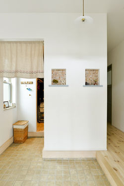 ![]() ナチュラル感を高める不揃いのタイルはイチオシ 雑誌で見てから導入を検討していたタイルは不揃いの形が特長。ランダムに張り合わせたラフなつくりが奥さまの絶賛ポイント | ![]() ニッチにはお気に入りの雑貨をディスプレイ。タイル×ニッチの組み合わせは玄関でも実践。さりげなく連動感を出した |